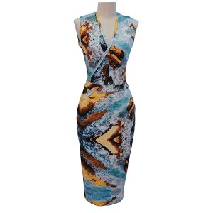 The Tide Dress is a flattering design with a cross front bodice, and pencil skirt with front pleat detail. The dress is made in polyester jersey, printed in our exclusive fabric prints. Can be worn with the Tide Wrap Skirt for a more formal look. The stretch jersey fabric makes the dress extremely comfortable to wear, it doesn’t crease or crinkle, is easy to wash and dries quickly.