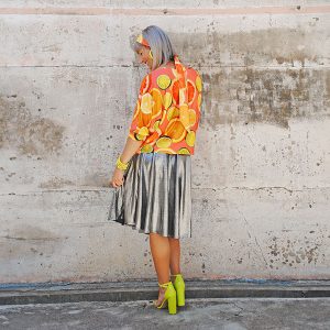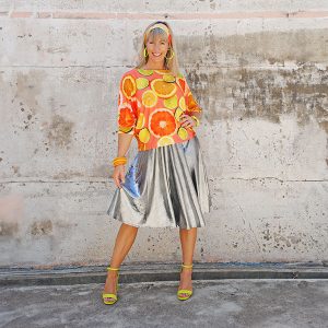 The model also wears the Metallic Silver Skirt.