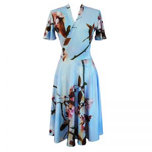 The Flutter Sleeve Dress is made in a Recycled Polyester Jersey (90% recycled polyester, 10% spandex).