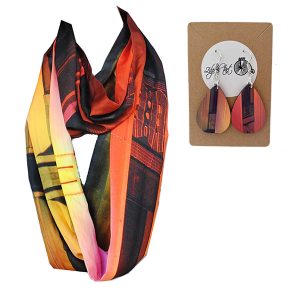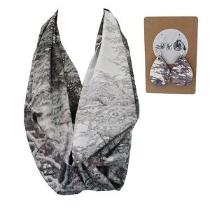 This gift pack comes with a printed loop scarf and matching printed earrings. They are gift wrapped in wrapping paper, ready for you to place under the tree.