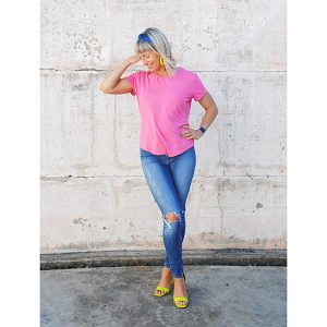 The Jelly Tee is made in a soft touch Rayon Jersey. 95% Rayon and 5% Spandex. This is a light, soft, stretchy fabric that feels lovely to wear.