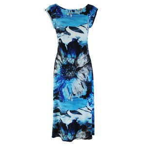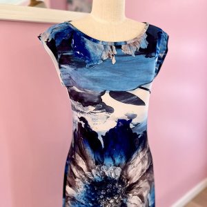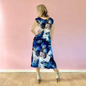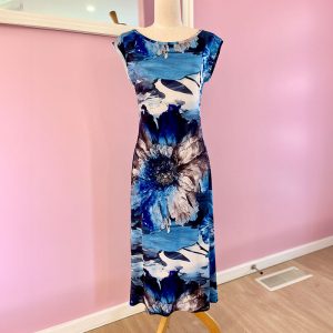 The Blue Floral Print Dress is made in a Polyester Jersey.  95% Polyester and 5% Spandex.
