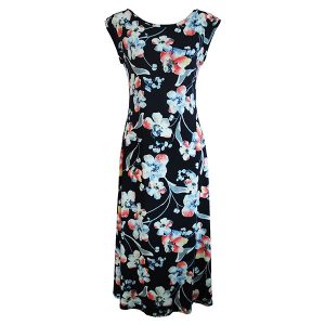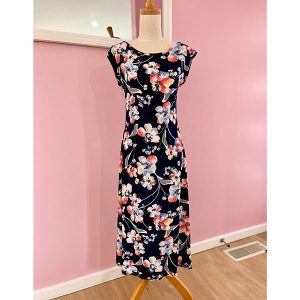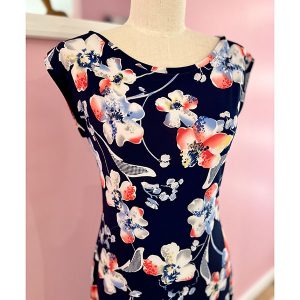 The Coral Floral Print Dress is made in a Polyester Jersey. 95% Polyester and 5% Spandex. The background colour is navy blue.
