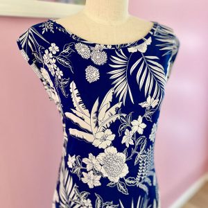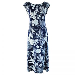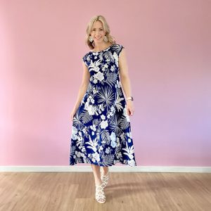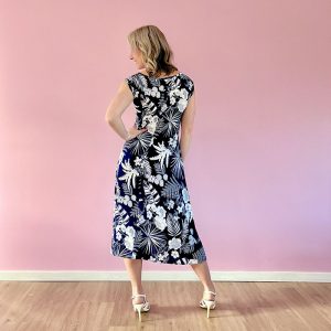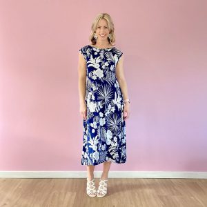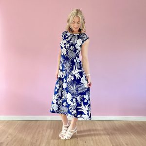 The Indigo Floral Print Dress is made in a Polyester Jersey. 95% Polyester and 5% Spandex.