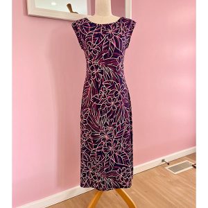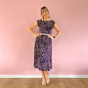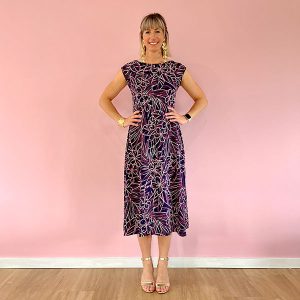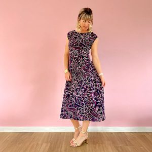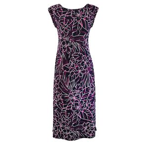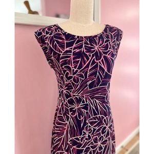 The Magenta Tropics Dress is made in a Polyester Jersey. 95% Polyester and 5% Spandex. The background colour is navy blue. The white flower patterns have a raised texture.