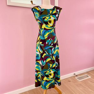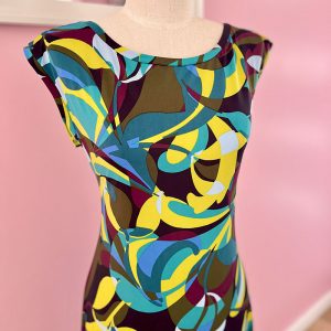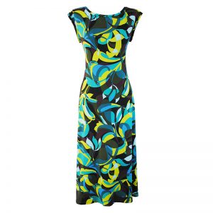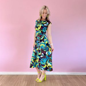 The Vibrant Retro Print Dress is made in a Polyester Jersey. 95% Polyester and 5% Spandex. The background colour is black.