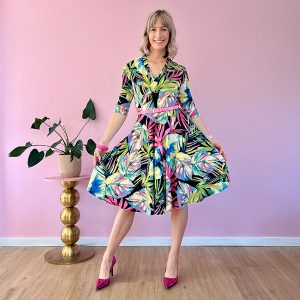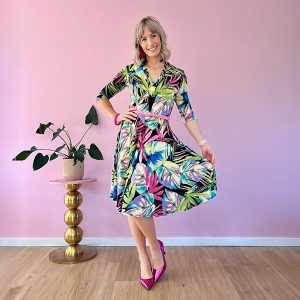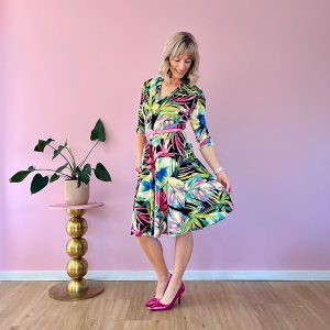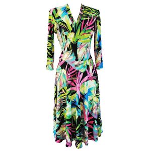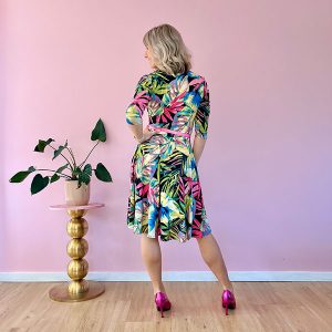 The Vibrant Jungle Dress is made in a Polyester Jersey. 95% Polyester and 5% Spandex.