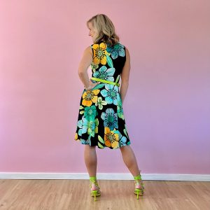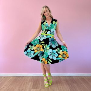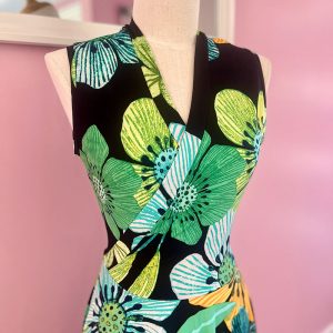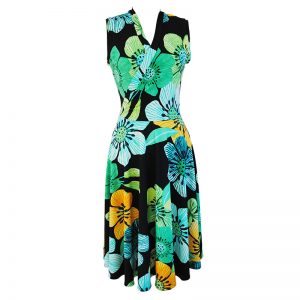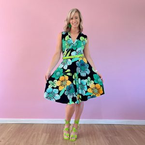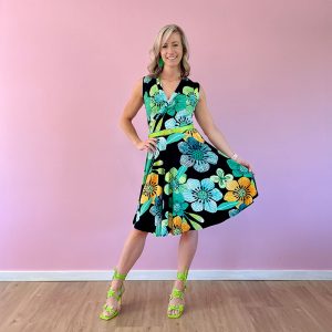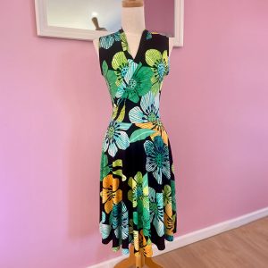 The Green Blossom print Dress is made in a Polyester Jersey. 95% Polyester and 5% Spandex. The background colour is black.