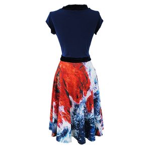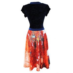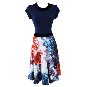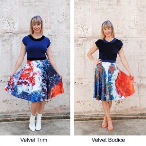 The Sapphire Dress is made in a Polyester Jersey with velvet contrast. 95% Polyester and 5% Spandex. There are two options: Full velvet bodice or velvet trim only.