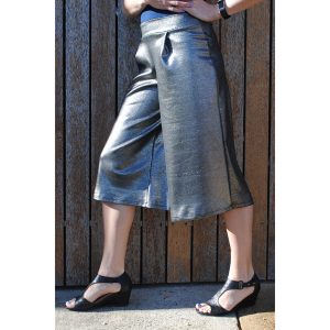 The Steel Culottes are stunning, and comfortable Culotte style pants. Made from metallic silver double knit stretch fabric, with a wide waistband, the pants are easy to move in and a great way to dress up an outfit.