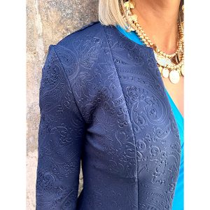 The lightweight Wish jacket is made in an embossed polyester spandex scuba knit jersey.