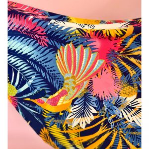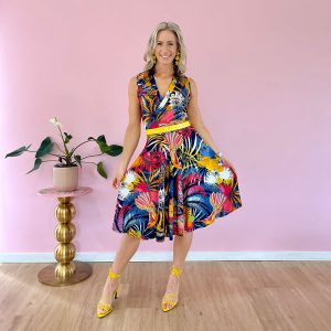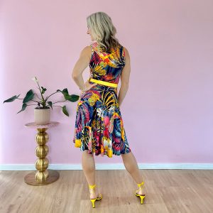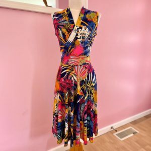 The Carnival Bird Dress is made in a slinky feel Polyester Jersey. 95% Polyester and 5% Spandex.